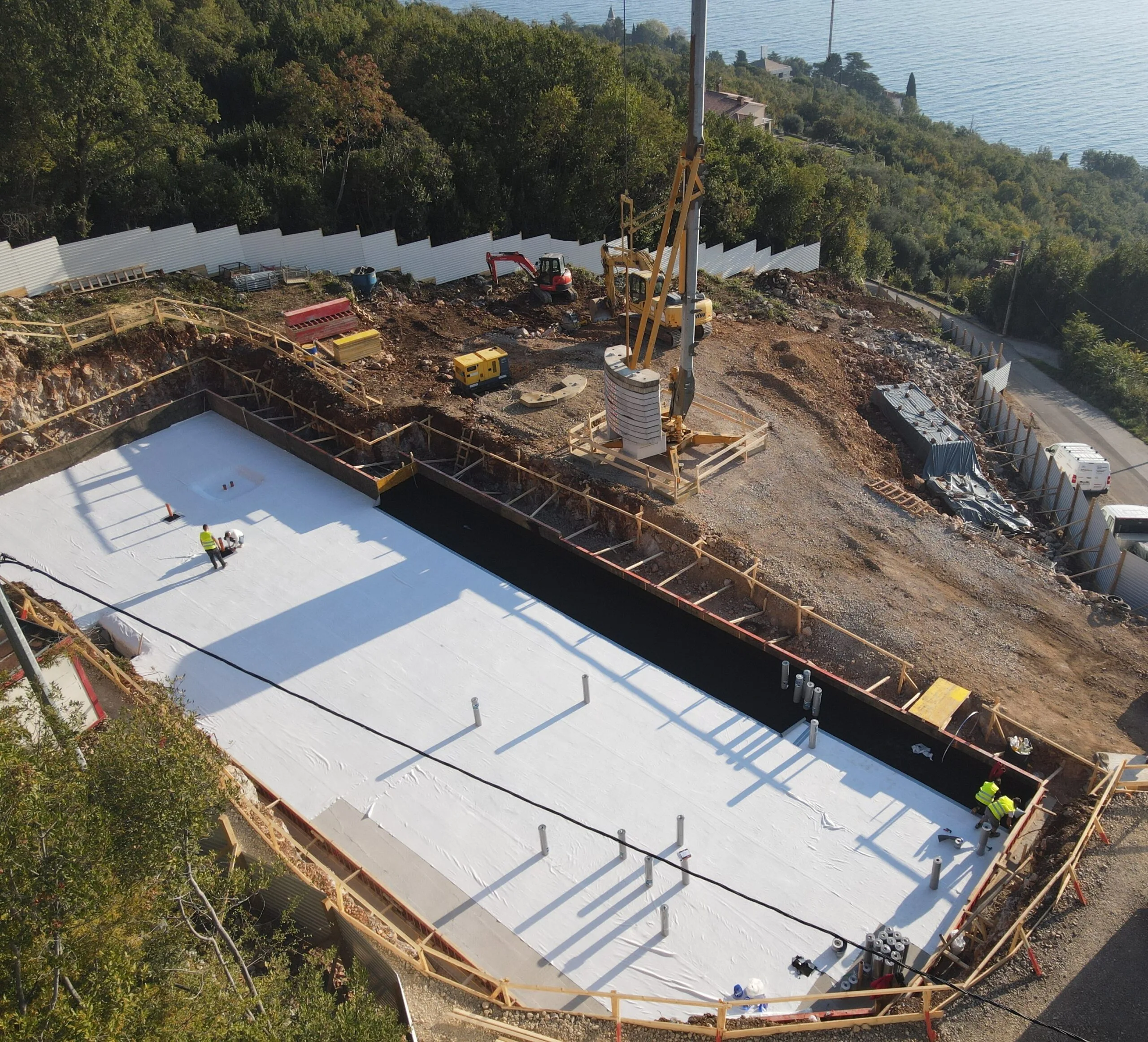 - Izvedba hidroizolacije na novogradnji pomoću sustava fleksibilnih hidroizolacijskih membrana koje osiguravaju vodonepropusnost i dugotrajnu zaštitu betonskih konstrukcija.