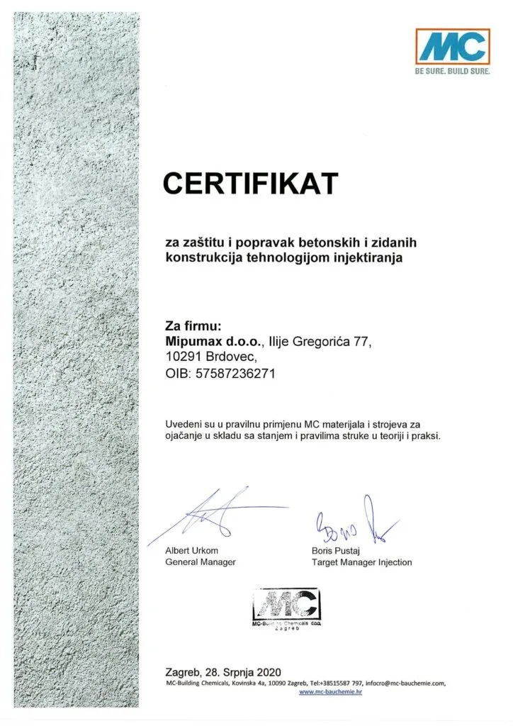 Tvrtka Mipumax d.o.o. je građevinska tvrtka sa sjedištem u Brdovcu, Zagrebačka županija, Hrvatska. Od osnutka tvrtka je specijalizirana za širok spektar usluga kao što su usluge injektiranja, strukturalnih popravaka i raznih hidroizolacijskih rješenja. Kroz godine poslovanja, profilirali smo se kao pouzdan i kvalitetan partner u industriji sanacija i obnove.